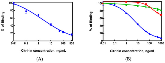 (A). The standard curve of citrinin (●) in a ciELISA. (B). Cross-reactivity of the CTN polyclonal antibody with CTN (●), ochratoxin A (■), and 1-hydroxy-2-naphthoic acid (▲) as determined by a cdELISA. Data were calculated by the average of three sets of experiments. The absorbance of the control, A0, with no toxin present was 1.5.