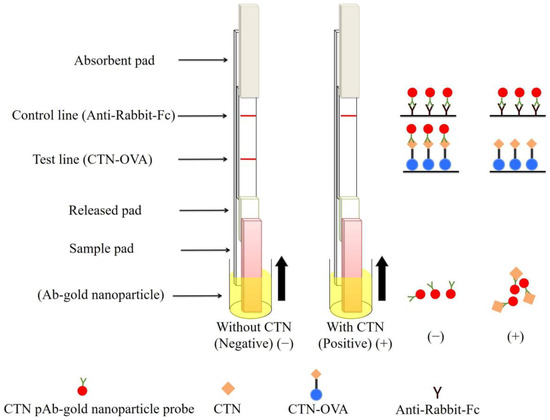 The assembly method of the immunostrip was achieved based on the method previously reported [19] with a slight modification. The immunostrip made up of three pads including sample, conjugate release and absorbent pads and the nitrocellulose membrane (NC membrane; pore size of 15 μm) with a test line and a control line. The test and control line of the NC membrane were drawn with 0.25 μL CTN-OVA (4 mg/mL) and 0.25 μL goat anti-rabbit IgG antibody (1 mg/mL), respectively, and then rested for 10 min at room temperature until the line was dried. Subsequently, the CTN polyclonal antibody-gold nanoparticle conjugate (8 μL per well) was applied to the sample solution or absorbed to conjugate release pad, which air dried at 37 °C for 10 min. The release pad was first pasted on the NC membrane by overcrossing 2 mm. Next, the sample pad was pasted on the release pad by overcrossing 2 mm. Finally, the absorbent pad was pasted on the topmost of the NC membrane for 2 mm crossover. The full assembled sheet was cut lengthways (4 mm) with an automatic cutter [34].