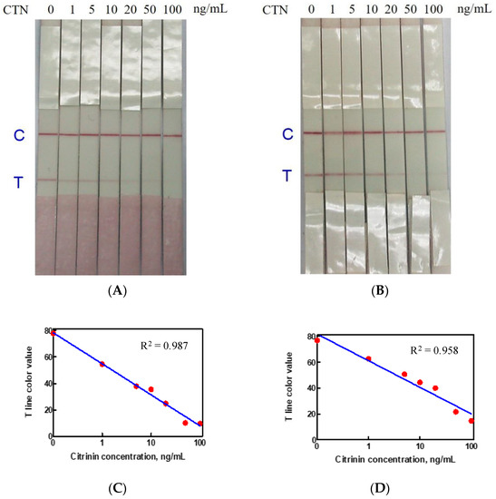 The visual detection limit of the immunostrip for CTN. Different concentrations (0–100 ng/mL) of a CTN certified standard was dissolved in PBS. (A) The visual detection limit is 20 ng/mL using 8 μL of Ab-gold nanoparticle conjugates were loaded into the sample solution; (B) the visual detection limit is approximately 20~50 ng/mL when 8 µL of conjugates were absorbed on the release pad. (C) The standard curve of the T line color density value without the release pad; when the value is less than 25 it indicates a positive result. (D) The standard curve for the T line color density value with the release pad; when the value is less than 25 it indicates a positive result. Each concentration was tested three repeats.