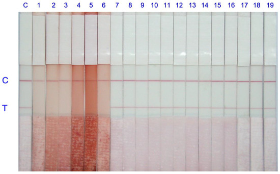 The 19 extracted red yeast fermented samples and one control sample (rice) were added to the microplate well to determine citrinin contamination using immunostrips. According to Table 2, samples 1 to 6 contained citrinin levels that were much higher than 20 ng/mL. Samples 7 to 19 contained citrinin levels lower than 20 ng/mL in the extraction solution. Therefore, in Figure 4, sample 1 to 6 yielded positive results with only a reddish line in the control zone of the membrane. Further dilutions of samples 1–6 (1:10; 1:20; 1:50) were subjected to the immunostrip test. The results were presented in the Figure S1. All dilution samples examined with immunostrips were positive with only a reddish line in the control zone which are consistent with the cdELISA results. Samples 7 to 19 yielded negative results with one clear red line in the test zone and the other in the control zone of the immunostrip.