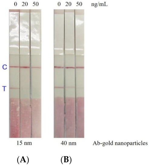 Two different sizes of gold nanoparticles were used for conjugation with antibodies. The competitiveness of the antigen on the test line with antibody-gold nanoparticles of 15 nm (A) is better than that of the 40 nm particles (B).