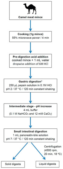 Schematic depiction of the stepwise in vitro digestion of camel mince under simulated human gastro-small intestinal conditions. (* Collection of gastric solid and liquid digesta as depicted for small intestinal digestion).