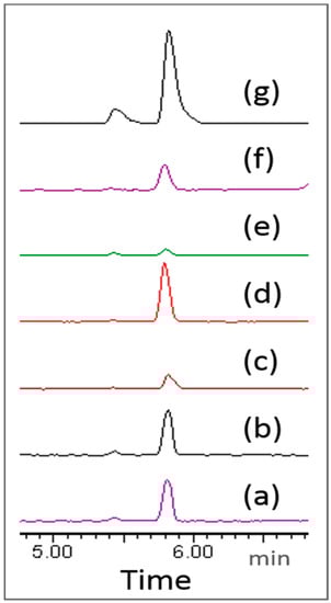 LC-MS/MS analysis of indospicine on Waters Micromass Quattro Premier triple quadrupole mass spectrometer utilizing a selected reaction monitoring (SRM) transitions of m/z 174 → 111 in (a) uncooked camel meat, (b) cooked camel meat, (c) solid phase of gastric digesta, (d) liquid phase of gastric digesta, (e) solid phase of small intestinal digesta, (f) liquid phase of small intestinal digesta, and (g) 0.05 mg/L standard indospicine solution.