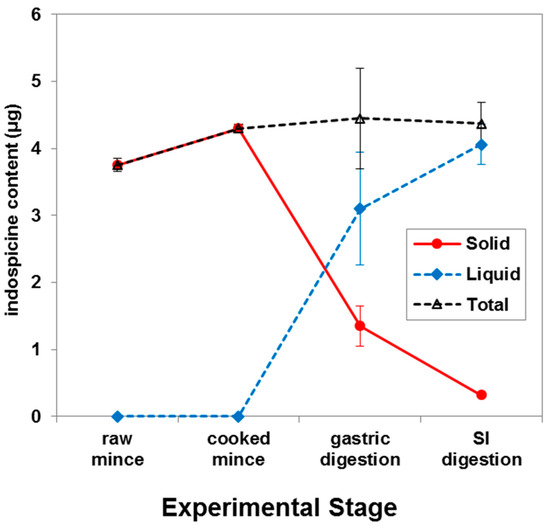 Results from this study indicate that there were no significant changes (p > 0.05) in the total indospicine content, suggesting that indospicine was not degraded during microwave cooking or gastrointestinal digestion in vitro (Figure 4). Cooking causes shrinkage of collagen fibres [33] and also increases meat protein surface hydrophobicity [34]. Indospicine is a water-soluble free amino acid, and this meat matrix breakdown during cooking and subsequent in vitro digestion resulted in an almost complete release of this amino acid from the solid phase into the liquid phase (Figure 4). This is evident from the observed release of approximately 70% indospicine from solid to liquid phase after the incubation of cooked meat with pepsin (during the gastric phase). Moreover, digestion with pancreatin and bile in the small intestinal phase resulted in a total release of more than 90% indospicine into the liquid digesta.