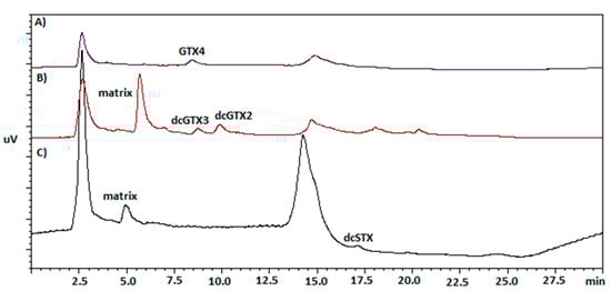 - Rey, V.; Alfonso, A.; Botana, L.M.; Botana, A.M. Influence of Different Shellfish Matrices on the Separation of PSP Toxins Using a Postcolumn Oxidation Liquid Chromatography Method. Toxins 2015, 7, 1324–1340. [Google Scholar] [CrossRef] [PubMed]