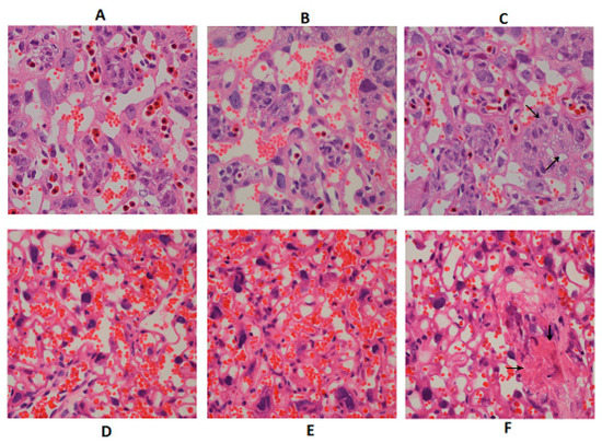 Hematoxylin and eosin (H&E) results were shown in Figure 2. Compared to the GD 12.5 d placenta (Figure 2A–C), larger number of blood sinus and more blood flow were found in GD 18.5 d placenta (Figure 2D–F). The placental morphology in the control and DON-L groups appeared to be normal both in GD 12.5 d and GD 18.5 d. However, for the DON-H groups in both GD 12.5 d and GD 18.5 d, decreased number of blood sinus and blood flow were found, and inflammatory cell infiltration was observed (see arrows in Figure 2C,F). In addition, vacuole-like changes, apoptosis and necrosis could be observed in some placenta syncytiotrophoblast.