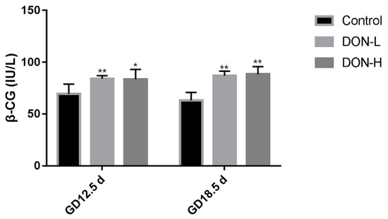 In addition to blood supply, the level of β-CG is another biomarker to reflect placental function. The level of β-CG was shown in Figure 3 on GD 12.5 d and GD 18.5 d, the level of β-CG in DON-treated groups were significantly higher than in the control (p < 0.05 in DON-H group on GD 12.5 d, and others all p < 0.01).