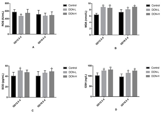 The levels of ROS, MDA, SOD and GSH were shown in Figure 4. On GD 12.5 d and GD 18.5 d, the levels of ROS in DON-treated groups were lower than in the control, however, it was significant only in DON-L group on GD 12.5 d (p < 0.01). MDA and GSH in all DON-treated groups were significantly higher than in the control, on GD 12.5 d and on GD 18.5 d (p < 0.01 and p < 0.05 respectively). SOD in all DON-treated groups were higher than in the control, but it was significant only in DON-L group on GD 12.5 d and in DON-H group on GD 18.5 d (both p < 0.05).