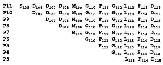 A conserved D106D107D108 motif at the N-terminal end of P11 has been shown to be critical for the interaction with trichosanthin (TCS) [34]. In the structure of the TCS–P11 complex, Asp108 of P11 interacted with Lys173 of TCS via salt bridges, while Asp106 of P11 formed hydrogen bonds with Gln169 of TCS [35]. However, in the two structures of this peptide with RTA, the D106D107D108 residues were not observed [27,28]. The substitution of Asp108 and Asp106 residues in P2 with alanine abolished the interaction between P2 and TCS [35]. However, these mutations did not affect the interaction of P2 with RTA [28]. Based on these results, Fan et al. concluded that the conserved D106D107D108M109 motif of P2 is not involved in the interaction with RTA and only hydrophobic interactions and hydrogen bonds contribute to the interaction [28]. In contrast, Shi et al. showed that although the D106D107D108 motif was not observed in the structure, the binding affinity of RTA measured by isothermal calorimetry (ITC) was lower when this motif was not present on the peptide than when this motif was present [27].
