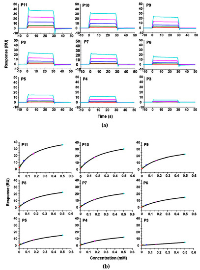 We used surface plasmon resonance (SPR) with Biacore T200 (GE Healthcare, Marlborough, MA, USA) to measure the affinity of these peptides for RTA. Because of solubility limitations, the highest concentration of peptide measured was 0.5 mM. For direct comparison of affinity with depurination activity, depurination buffer was used as the running buffer for the Biacore analysis. The dose-dependent interaction sensorgrams are shown in Figure 2a and the fitting is shown in Figure 2b. The interaction sensorgrams of peptides with RTA showed fast on and fast off characteristics, suggesting fast association and fast dissociation, and thus relatively low affinity (Figure 2b). As the peptide concentration increased, the equilibrium binding levels increased. Due to the fast association and dissociation, equilibrium data were used to calculate the dissociation constants (KD). The KDs of the peptides are shown in Table 1. Overall, the affinity of the peptides for RTA was in the high micromolar range. The affinity of RTA for the peptides was 105 times lower than its affinity for the ribosome, which is in the low nanomolar range [23]. The KD increased from 196 µM to 451 µM as the number of amino acids decreased from 11 (P11) to 4 (P4). Deletion of the three aspartic acids (D106D107D108) did not decrease the affinity dramatically, as the KD was 272 µM for P10 and around 300 µM for P9, P8, and P7. The decreased affinity was mainly due to the deletion of Asp106. The KD did not change much when Asp107 and Asp108 were deleted. The KD increased from 294 µM to 399 µM with the deletion of Met109 and to 497 µM when Gly110 was deleted, indicating the importance of Met109 and Gly110 in the interaction. Deleting Phe111 did not change the affinity appreciably. However, upon deleting Gly112, the affinity decreased dramatically, indicating that the peptide with only the last three amino acids of P proteins almost lost the ability to bind RTA.