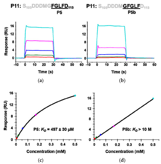 The interaction of peptides mimicking the last five amino acids (P5) of the P proteins (a,c) and the penultimate five amino acids (P5b) with RTA (b,d). The KD was determined by Biacore T200 using the same conditions as in Figure 2. The binding sensorgrams are shown in (a,b) and the fitting is shown in (c,d).