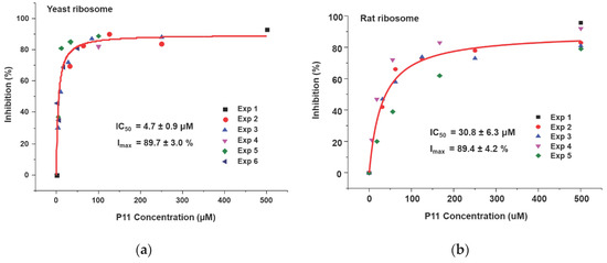 We showed that the peptides bind to the ribosome binding site of RTA and affect the interaction of RTA with the ribosome. Based on our ribosome depurination model, if ribosome binding of RTA is reduced then depurination of the SRL on the ribosome should be affected. To test this model, we examined the ability of the peptides to inhibit the depurination activity of RTA on yeast and rat liver ribosomes. Both ribosomes were used since RTA depurinates rat liver ribosomes at a much higher rate than yeast ribosomes [30]. Different concentrations of peptides were incubated with RTA first, and then ribosomes were added to start the depurination reaction. After 5 min at room temperature, the reaction was stopped and the level of ribosome depurination was measured by qRT-PCR [31]. The percent depurination was plotted against the concentration of the peptide (Figure 6). The IC50 values were obtained by fitting the inhibition curves with the Michaelis–Menten equation using the Origin Pro 9.1 software (OriginLab, Northampton, MA, USA). The inhibition of depurination of yeast (Figure 6a) and rat liver (Figure 6b) ribosomes by P11 are shown. As peptide concentrations increased, the percentage of inhibition increased, and percent inhibition reached 90% for both ribosomes. The IC50 of P11 was 4.7 µM for yeast ribosomes and 31 µM for rat liver ribosomes (Table 2). The IC50 values of P10 to P3 were measured using the same method for yeast (Figure S1) and rat liver (Figure S2) ribosomes and data are shown in Table 2. The IC50 values for yeast ribosomes increased from 7.9 µM to 15 µM when D106 was deleted and to 23 µM and 34 µM when D107 and D108 were deleted, respectively. Similarly, the IC50 values for rat ribosomes increased from 83 µM to 142 µM when D106 was deleted and to 267 µM when D107 was deleted. These results demonstrated that the D106D107D108 motif is important for inhibition of the depurination activity of RTA. The IC50 values were about 6 to 10 times higher for rat ribosomes than yeast ribosomes, possibly because RTA depurinates rat ribosomes at a higher rate than yeast ribosomes [30]. We could not measure IC50 for P7 to P4 for rat ribosomes because the peptide concentrations needed were prohibitive and limited by solubility. We could not detect any inhibition activity for P3 and P5b at the highest concentration measured (500 µM). The IC50 values correlated with the RTA interaction results (Table 1) and indicated that inhibition of ribosome binding by peptides with even a low affinity could lead to inhibition of the depurination activity of RTA.