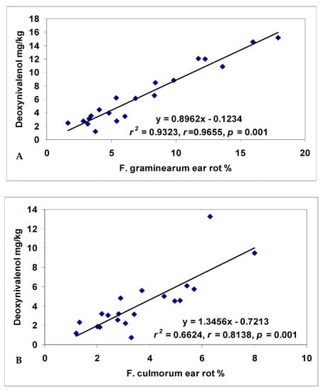 Regression relationships and correlations between ear rot and DON data for F. graminearum (A), F. culmorum (B), and both together (C), 2012–2013.