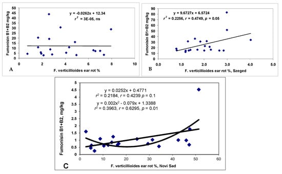 Regression relationships and correlations across years and isolates between pooled ear rot and DON data for F. verticillioides (A), Szeged (B) and Novi Sad /NS/ (C), ns = non significant, 2012–2013.