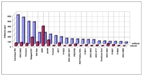2017 was rather dry and hot; no significant DON (mean 0.24 mg/kg) and fumonisin (1.82 mg/kg) was found in the MKK resistance test for natural infection. However, aflatoxin contamination was very strong (Figure 7). The maximum value was 385 g/kg for natural and 562 g/kg for the artificial inoculation. The mean is 51 and 157 g/kg for the natural and artificial inoculation, respectively. Visual infection was 0.47% ear rot (0.02–0.82%). This means that the visual ear rot rates were nearly the same in the two years, but aflatoxin means increased from 15.69 to 58 g/kg. Three hybrids were identical: Janett increased from seven to 114 g/kg, DKC4714 started from 24.5 g/kg and decreased to 14 g/kg, and Korimbos was 0.10 g/kg in 2014 and reached 562 g/kg in 2017. This shows clearly we do not have a pattern that would say that an increase, for example, in temperature, drought, etc. increases or decreases aflatoxin by x%. As a mean this might be true, but for the individual hybrids it does not say anything. DKC4714 is very interesting. In spite of the much more favorable conditions it had a lower 2017 aflatoxin level than under the not favorable 2014. Of course, this a problem in phenotyping and might have serious problems in genetic work where we need a high accuracy. We should say that we have very limited or no information about the genetic and other causes of the changes in aflatoxin production, especially for individual hybrids. We have, however, several hypotheses to test to improve reliability of the data. The only possibility is now that the given hybrid must have low values in all tests to classify them to low, medium or high-risk category. Therefore, we need more data to exclude artifacts. This is valid for both artificial and natural data.