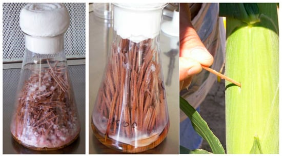 We preferred this method because mid-ear inoculation gave more stable results [44] than the silk channel method and also because our similar findings (unpublished) showed similar results. Furthermore, the severity of the disease is higher, and the differentiation of the hybrids is better. We used it for all toxigenic fungi. Otherwise the comparison of the resistance levels to different fungi can be problematic. For inoculation the toothpick method of Young [54] was used, modified by Mesterhazy [32]. The toothpicks were boiled with ion charged water each time for two hrs. from the start of boiling. When the color of the water after the third boiling had some color, a fourth boiling followed. This was important as tannins and other compounds in the wood inhibit fungal growth and they should be removed. Then, the toothpicks were air dried; depending on the number of plants to inoculate, smaller or larges flasks were filled with the necessary number of toothpicks with 10% plus as reserve. The flasks were then filled with liquid Czapek-Dox medium for 2 h. Then the medium was poured out except for 5 mm thick liquid to provide humidity for the fungal growth. The closed flasks were autoclaved at 1.20 bar pressure for 2 h. After cooling they were inoculated from test tubes grown from revitalized isolates from the freezer. In three weeks the inoculum was ready to use (Figure 8). We used single spore cultures and all inoculations were made separately. This means that the 8 rows of a 9 row plot were inoculated with 2-2 isolates of the toxigenic fungi with one left untreated for natural infection. The isolates were stored in lyophilized form at 80 °C. The same isolates were used in both years and locations to produce comparable results.