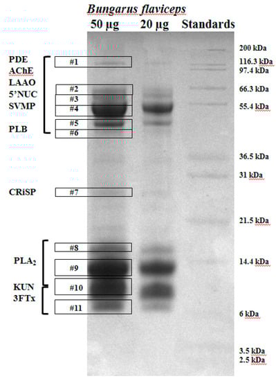 - Shan, L.L.; Gao, J.F.; Zhang, Y.X.; Shen, S.S.; He, Y.; Wang, J.; Ma, X.M.; Ji, X. Proteomic characterization and comparison of venoms from two elapid snakes (Bungarus multicinctus and Naja atra) from China. J. Proteom. 2016, 138, 83–94. [Google Scholar] [CrossRef] [PubMed]