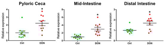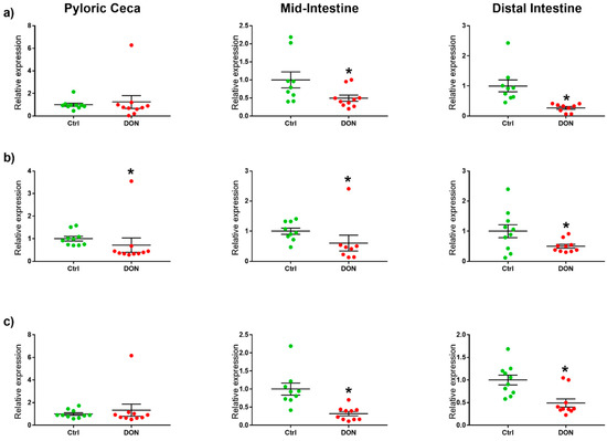 The data for the DON group are presented as mean ± standard error of the mean (SEM) relative to the mean ± SEM for the control group for the same intestinal segment; * Significant differences (unpaired t-test or Mann–Whitney U test, p < 0.05) between the experimental groups in the same intestinal segment. The values that differ significantly are highlighted in bold text. n = 10 for each group/gene/intestinal segment unless otherwise stated: a: n = 9, b: n = 8, and c: n = 7.