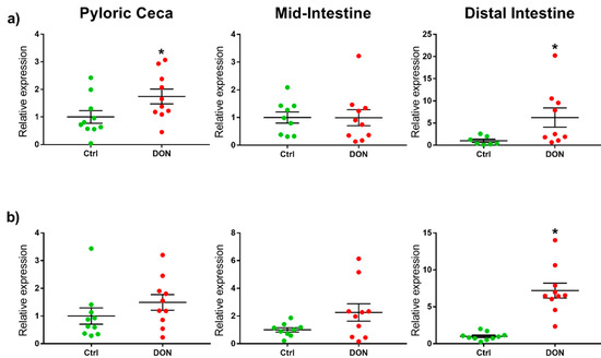 Figure 3. Relative expression of suppressors of cytokine signaling (SOCS) in the intestine of salmon fed DON (5.5 mg/kg feed) or no DON (controls) for eight weeks. * Significant differences (unpaired t-test or Mann–Whitney U test, p < 0.05) between the experimental groups in the same intestinal segment. The relative expression of markers for the suppressors of cytokine signaling (a) SOCS1 and (b) SOCS2 were significantly higher in the distal intestine from fish fed DON compared with the controls. The relative expression of the marker for SOCS1 was also significantly higher in the pyloric ceca from fish fed DON compared with the controls.