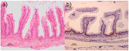 Histological examination did not reveal pathological changes in the intestines of any fish (see Figure 4a). The polarization of the enterocytes seemed non-affected, the density of goblet cells appeared similar in both dietary groups, while proliferating cells were mainly detected at the base of the intestinal folds with an equal pattern for both groups (see Figure 4b).
