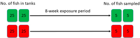 Figure 5. Design of the study on Atlantic salmon fed DON (5.5 mg/kg diet, red color) or no DON (controls, green color) for eight weeks. Five fish from each tank were sampled eight weeks after the start of the feeding trial.