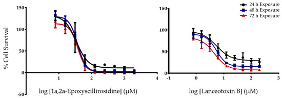 When Neuro-2a cells were exposed to 1α,2α-epoxyscillirosidine, there were no significant time-dependent effects between the EC50s at 24, 48 and 72 h exposure. The EC50s of 1α,2α-epoxyscillirosidine did not significantly differ between exposure times (Table 1). The percentage cell survival decreased with higher 1α,2α-epoxyscillirosidine concentrations as shown with the non-linear regression curves (Figure 2). Lanceotoxin B had EC50s below 10 µM for all exposure times (Table 1). As with 1α,2α-epoxyscillirosidine, lanceotoxin B showed a clear concentration dependent effect, with higher concentrations reducing the Neuro-2a cell survival (Figure 2).