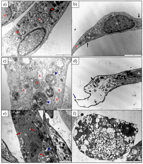 Electron micrograph of (a,b) untreated H9c2 cells and H9c2 cells exposed to (c) 25 µM and (d) 100 µM 1α,2α-epoxyscillirosidine for 24 h; (e) 100 µM 1α,2α-epoxyscillirosidine for 48 h; (f) 100 µM 1α,2α-epoxyscillirosidine for 72 h. The untreated cells were long and thin with tapered ends. The cytoskeleton was associated with the plasma membrane (black arrows). The H9c2 cells treated with 1α,2α-epoxyscillirosidine has plasma membrane damage (blue arrow), swollen RER and perinuclear spaces (red arrows) and cells were extensively vacuolated. Autophagic vesicles could be seen within the cytoplasm (blue arrow heads). G—Golgi Complexes; M—Mitochondria; N—Nuclei; R—Rough Endoplasmic Reticulum. The scale bar at the bottom right corner represents 5 µm (b,f), 2 µm (a,d,e) and 1 µm (c) respectively.