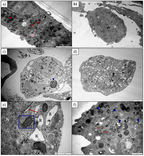 Electron micrograph of (a,b) untreated Neuro-2a cells and Neuro-2a cells exposed to (c) 100 µM 1α,2α-epoxyscillirosidine for 24 h; (d,e) 100 µM 1α,2α-epoxyscillirosidine for 48 h; (f) 100 µM 1α,2α-epoxyscillirosidine for 72 h. The organelles of untreated Neuro-2a cells appeared normal, with round or slightly convoluted nuclei. Cells exposed to 1α,2α-epoxyscillirosidine were extensively vacuolated, with swollen RER and perinuclear spaces. The cristae of some mitochondria were ballooned, and the nuclei were radially segmented. Many autophagic vesicles could be seen within the cytoplasm (blue arrow heads). G—Golgi complexes; M—Mitochondria; N—Nuclei; R—Rough Endoplasmic Reticulum. The scale bar at the bottom right corner represents 5 µm (b,c), 2 µm (a,d), 1 µm (f) and 0.5 µm (e) respectively.