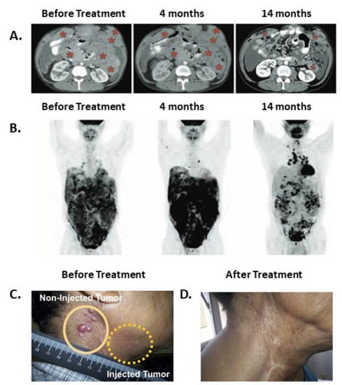 Regression patterns after immunotoxin therapy suggest that anti-tumor immunity developed. (A,B) A patient follow-up after receiving IV SS1P, pentostatin and cyclophosphamide. Abdominal CT (A) and PET scans (B) before treatment, at 4 months, and at 14 months from entering the trial. Red asterisks indicate tumor mass. This patient completed two cycles of treatment and received no treatment thereafter. The figure was reproduced from Hassan et al. 2013, with permission from science publishing group [38]. (C,D) Resolution of injected (C) and non-injected (D) tumors in a patient with squamous cell carcinoma of the head and neck. VB4-845 immunotoxin was injected only into the tumor marked with a dashed yellow line. The figure was reproduced from MacDonald et al. [39]. 2009, and modified with permission from Dove Medical Press.