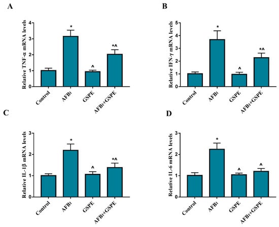 Protective role of GSPE treatment on AFB1-induced mRNA expression levels of the pro-inflammatory genes in the spleen of broilers. The mRNA expression of TNF-α, IFN-γ, IL-1β, and IL-6 were detected by quantitative real-time PCR. All data were expressed as mean ± SD (n = 6). Different symbols among groups indicate significant difference by LSD test (p < 0.05). * (p < 0.05) significant differences compared to the control group and ^ (p < 0.05) significant differences compared to the AFB1 group. (A) Tumor necrosis factor alpha (TNF-α); (B) interferon gamma (IFN-γ); (C) interleukin-1 beta (IL-1β); (D) interleukin 6 (IL-6).