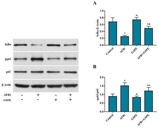 Protective role of GSPE treatment on the AFB1-induced degradation IκBα (A) and phosphorylation of NF-κB (p65) (B). The protein expression of β-actin, p65, pp65, and IκBα protein were detected by western blotting in the spleen of broilers. All data were expressed as mean ± SD. Different symbols among groups indicate significant difference by LSD test (p < 0.05). * (p < 0.05) significant differences compared to the control group and ^ (p < 0.05) significant differences compared to the AFB1 group.