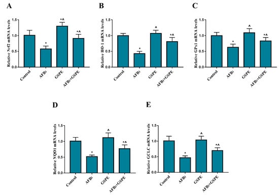 We assessed the protective effects of GSPE against AFB1-induced oxidative damage through regulating the Nrf2 signaling pathway in the liver of broiler chickens. The mRNA levels of HO-1, GPx1, NQO1, GCLC, and Nrf2 were examined by quantitative real-time PCR. The results of AFB1 treatment group showed (Figure 4) a significant decrease in the mRNA level of Nrf2 gene, as compared to the control group. The supplementation of GSPE to dietary treatments showed (p < 0.05) increase in the gene expression of Nrf2 in the liver of broilers by 22% and 56% when compared with the control and AFB1 group, respectively (Figure 4A). Moreover, compared to the control group, the mRNA expression level of HO-1, GPx1, NQO1, and GCLC genes in the AFB1 group were (p < 0.05) down-regulated. In contrast, the addition of GSPE to the AFB1 contaminated diet showed significant improvement in the mRNA expression levels of HO-1, GPx1, NQO1, and GCLC decreased by AFB1 Figure 4B–E.