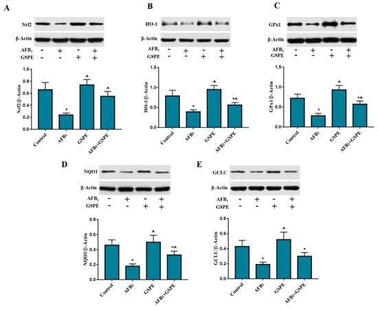 Protective role of GSPE treatment on AFB1-induced protein expression levels of the Nrf2 signaling pathway in the liver of broilers. The protein expression of β-actin, Nrf2, HO-1, GPx1, NQO1, and GCLC were detected by western blotting. All data were expressed as mean ± SD. Different symbols among groups indicate significant difference by LSD test (p < 0.05). * (p < 0.05) significant differences compared to the control group and ^ (p < 0.05) significant differences compared to the AFB1 group. (A) Nuclear erythroid-2-related factor (Nrf2); (B) heme oxygenase-1 (HO-1); (C) glutathione peroxidase 1 (GPx1); (D) quinone oxidoreductase 1 (NQO1); (E) glutamate-cysteine ligase catalytic subunit (GCLC).