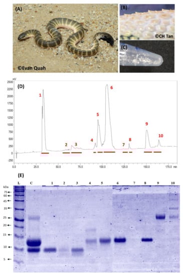 (A) Spine-bellied sea snake, Hydrophis curtus from Penang Island, Malaysia. (B) Protruding spine-like structures on the ventral scales of the snake. (C) Lyophilized H. curtus venom in whitish crystalline form. (D) Decomplexation of H. curtus (Penang, Malaysia) venom with C18 reverse-phase HPLC. (E) 15% SDS-PAGE of H. curtus venom and its HPLC fractions under reducing conditions. L: Protein markers; C: Whole venom. Numbers indicate HPLC fractions.