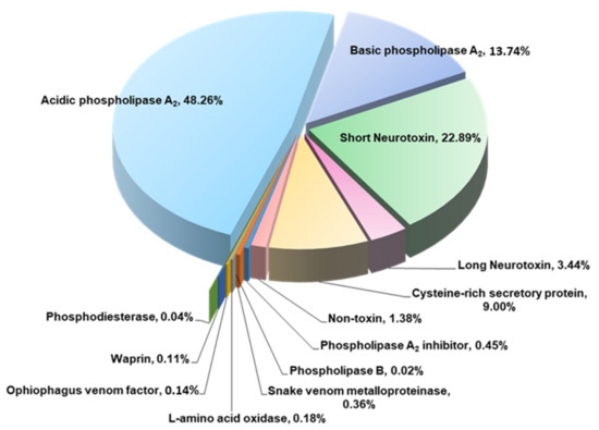 Venom proteome of the spine-bellied sea snake, Hydrophis curtus from Penang Island, Malaysia. Percentages indicate relative protein abundance by total venom proteins.