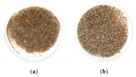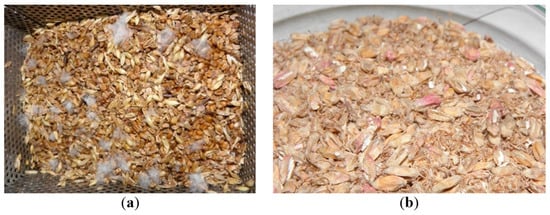 Barley germ and rootlets are the result of the ending phase of the malting process []. After the final phase of drying, degermination is carried out. Germ and rootlets have a lower water content, but because of their high nutritive value in amino acids and fat content, they are susceptible to microbial degradation. Inappropriate storage and management of these materials can lead to the loss of nutritive substances and mycotoxins concentration increase [,]. Figure 2 shows a significant reduction of germ/rootlets in malt severely contaminated with Fusarium graminearum (sample b). The higher the initial Fusarium contamination, the poorer the germ development will be.