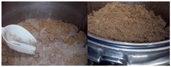 Brewer’s spent grain is obtained after the filtration of mash and are a moist brewing by-product. Spent grain can be used as animal feed in various forms: fresh (wet) (Figure 3), ensiled, or dehydrated (dried) grain []. Spent grain is often used as a supplement for lactating cows []. Since spent grains and spent yeast are very nutritious, and contain high amounts of available water [], they are susceptible to microbial growth and are very perishable. Before storage, any excess water must be removed to ensure microbial safety and to prolong the shelf life. Spent yeast also must be treated in additional processes to inactivate the living yeast cells because ruminants have a complex mixture of micro flora to help breakdown the cellulose into simpler carbohydrates they can use for energy. Although small amounts of live yeast can be safe for ruminants, excessive amounts of live yeast cells can disrupt the gut microbiology. This ends up as a gas build up that can block their airways, causing suffocation and even death. Drying also improves the storability of these by-products and enables easier transportation and handling [].