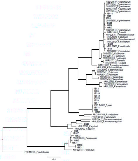 The partial sequences of elongation factor (EF-1α) and the second fragment of RPB2 (7CF/11AR) were selected in order to identify the Fusarium isolates. The amplification of the EF-1α and RPB2 loci were performed according to [,]. Amplicons were purified with ExoSAP-IT (Affymetrix, Santa Clara, CA, USA) and sent to the Centre of Human Genome Studies, University of Sao Paulo, Brazil for sequencing in ABI PRISM 3130 DNA Analyzer (Applied Biosystems, Foster City, CA, USA).