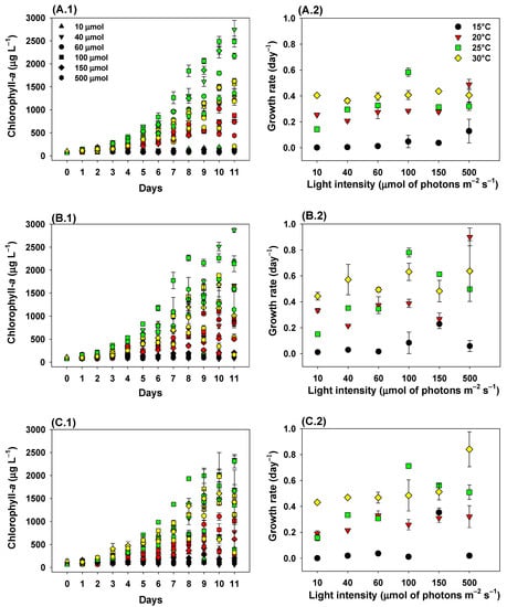 Growth based on chlorophyll-a (1) and calculated growth rates (2) of Cylindrospermopsis raciborskii strains under the combinations of six light intensities and four water temperatures. Letters indicated C. raciborskii strains: CYLCAM-01 (A); CYLCAM-02 (B) and CYLCAM-03 (C). Symbols indicate light intensities: Up triangles = 10 µmol photons m−2 s−1; down triangles = 40 µmol photons m−2 s−1; circles = 60 µmol photons m−2 s−1; squares = 100 µmol photons m−2 s−1; diamonds = 150 µmol photons m−2 s−1; hexagons = 500 µmol photons m−2 s−1; Colors indicate temperatures: black = 15 °C; red = 20 °C; green = 25 °C; yellow = 30 °C. Bars are standard deviations (n = 3).