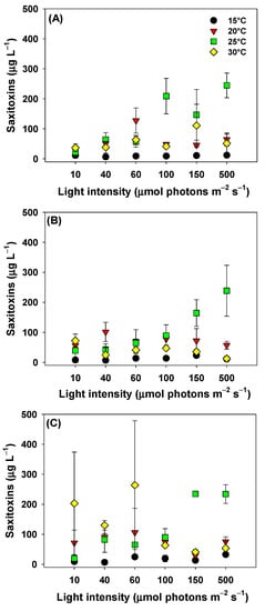 Light and temperature are environmental variables that affect the photosynthetic apparatus and metabolism in phytoplankton species [,,] and consequently affects the metabolic via to STX production []. Laboratory experiments demonstrate that STX production can be affected by light intensity. For example, C. raciborskii T3 strain showed greatest concentration of STX and NEO at 100 µmol photons m−2 s−1, compared with 50 and 150 µmol photons m−2 s−1 []. Our results showed the highest production of STXs at light intensities equal to or greater than 100 µmol photons m−2 s−1.