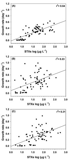 Positive linear relations between growth rates and STX concentrations for the three C. raciborskii strains were found (Figure 4). CYLCAM-01 strain showed a high correlation (r2 = 0.54) (Figure 4A) in relation with others (Figure 4B,C).