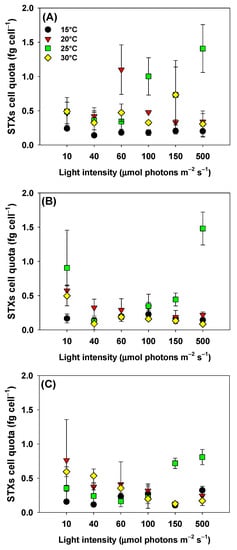 STXs cellular quota of three strains of C. raciborskii under the combinations of the six light intensities and four water temperatures. CYLCAM-01 (A); CYLCAM-02 (B) and CYLCAM-03 (C). Black circles = 15 °C; down red triangles = 20 °C; green squares = 25 °C; yellow diamonds = 30 °C. Bars on the vertical lines are standard deviations (n = 3).