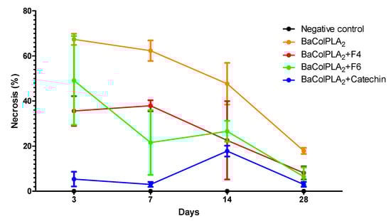 Figure 1 shows the extent of muscle necrosis at different intervals after the i.m., injection of BaColPLA2 (50 μg). Maximum necrosis (67.3 ± 2.5% of fibers affected) was seen three days post-injection and involved extensive vacuolization and necrosis of the sarcoplasm. Thereafter, there was a progressive decrease in necrosis. However, ~18% of the fibers still showed damage after 28 days. None of the negative control groups (0.9% saline, F4, F6 or catechin) showed necrosis. Inoculation of BaColPLA2 with F4, F6, and catechin significantly decreased the necrosis, with catechin being the most effective in preventing muscle damage, particularly in the first seven days post-injection (Figure 1 and Table 1).