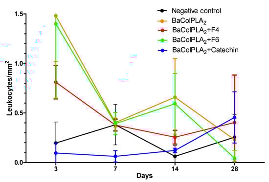 Repair mediated by inflammation was observed in all PLA2-treated groups, with a marked leukocytic infiltration in the first days in muscle injected with PLA2 alone. Muscle injected with PLA2+F4 or F6 showed less leukocytic infiltration that was significantly lower than with PLA2 alone on day 3, but not on days 7 and 28. Muscle injected with PLA2+catechin had a significantly lower number of leukocytes than the other groups at the same intervals. These findings agreed with the histopathological analysis in which muscle injected with PLA2+catechin showed a very low percentage of necrosis.
