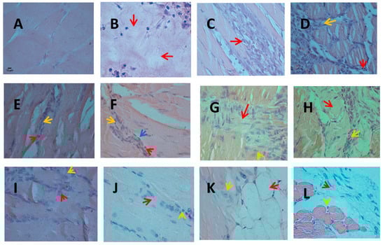 Representative photomicrographs of mouse gastrocnemius muscle with different treatments. (A) Negative control (a similar absence of alterations was seen with F4, F6, or catechin alone, not shown). (B) Muscle inoculated with BaColPLA2 on day 3. Arrow indicates diffuse muscle fiber damage. (C) Muscle inoculated with BaColPLA2 on day 7. Arrows indicate moderate multifocal leukocytic infiltration among the muscle fibers. (D) Appearance of muscle inoculated with BaColPLA2 pre-incubated with F4 or F6 on day 3. The red arrow indicates leukocyte infiltration among necrotic muscle fibers and the yellow arrow indicates hypertrophic fibroblasts. (E) Muscle inoculated with BaColPLA2 pre-incubated with catechin on day 3. The red arrow indicates slight infiltration of neutrophils and the yellow arrow indicates slight fibrosis. (F) Muscle inoculated with BaColPLA2 pre-incubated with F4 on day 7. The red arrow indicates infiltration of neutrophils, the yellow arrow indicates discrete fibrosis and the blue arrow indicates a satellite cell. (G) Muscle inoculated with BaColPLA2 pre-incubated with catechin on day 7. The red arrow indicates discrete focal fibrosis and the yellow arrow indicates a mild neutrophil infiltrate. (H) Muscle inoculated with BaColPLA2 on day 14. The red arrow indicates small foci of myonecrosis and the yellow arrow indicates a moderate number of neutrophils. (I) Appearance of muscle inoculated with BaColPLA2 pre-incubated with F4 or F6 on day 14. The red arrow indicates moderate multifocal infiltrate of neutrophils and the yellow arrow indicates discrete focal fibrosis. (J) Muscle inoculated with BaColPLA2 pre-incubated with catechin on day 14. The red arrow indicates discrete focal fibrosis and the yellow arrow indicates a slight infiltration of neutrophils. (K) Muscle inoculated with BaColPLA2 on day 28. The red arrow indicates focal infiltration of the adipose tissue. The yellow arrow indicates discrete neutrophil infiltration. (L) Muscle inoculated with BaColPLA2 pre-incubated with catechin on day 7. The red arrow indicates occasional fibrosis and the yellow arrow indicates a few neutrophils in the surrounding adipose tissue. Scale bar represents 10 µm (all panels). Hematoxylin &Eosin stain. 100×.