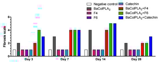 Fibrosis based on the presence of collagenous fibers assessed 3, 7, 14, and 28 days after the injection of PLA2 (50 µg/100µL) or PLA2+F4, F6, or catechin (all in a fixed volume of 100 µL). BaColPLA2: PLA2 from Colombian B. asper venom. Cat: (+)-catechin. F4 and F6: fractions 4 and 6, respectively, of S. macrophylla. Negative control—saline solution.