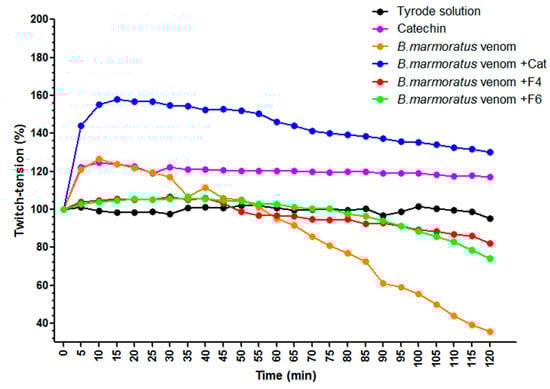 Phrenic nerve-diaphragm preparations obtained from male mice killed with an overdose of isofluorane were mounted under a resting tension of 5 g in a 5 mL organ bath containing aerated (95% O2 and 5% CO2) Tyrode solution (composition, in mM: NaCl 137, KCl 2.7, CaCl2 1.8, MgCl2 0.49, NaH2PO4 0.42, NaHCO3 11.9, and glucose 11.1) at 37 °C [].Supramaximal stimuli (0.1 Hz and 0.2 ms for indirect stimulation) were delivered from a Grass S88 stimulator (Grass Instrument Co., Quincy, MA, USA) and muscle twitches were recorded using a Model MLT0201 force transducer 5 mg–25 g (Panlabsl, AD Instruments Pty Ltd., Barcelona, Spain) connected to a Power Lab/4SP (Quad Bridge, AD Instruments, Barcelona, Spain). After stabilization for 20 min, B. marmoratus venom (100 µg/mL, final concentration in the organ bath) alone or venom pre-incubated with F4, F6, or catechin was added to the preparations and left in contact for 120 min to examine their influence on muscle contractile responses. In the pre-incubation protocols, the venom was incubated with fractions in a venom:fraction ratio of 1:10 or with 3.1 mM catechin for 20 min. Negative controls consisted of fractions F4 and F6 or catechin alone.