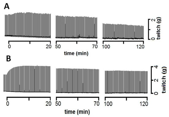 Representative recordings of the twitch-tension responses of mouse phrenic nerve-diaphragm preparations incubated with (A) B. marmoratus venom (100 µg/mL) and (B) B. marmoratus venom pre-incubated with 3.1 mM catechin prior to addition to the organ bath. Pre-incubation with catechin exacerbated the facilitation and inhibited the venom-induced decrease in contractile force. The recordings are representative of three experiments in each case.