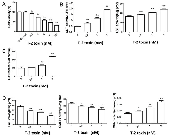 The cytotoxic effect and oxidative damage in the L02 cell line, which was incubated with T-2 toxin for 12 h. (A) The L02 cell line was incubated with 0–125 nM T-2 toxin for 12 h. The cytotoxic effect on cellular proliferation was determined by MTT assay. The levels of ALT, AST (B), and LDH (C) present in the cell culture medium were determined enzymatically using a commercial kit (Naning KeyGen Biotech, Nanjing, China). Results are the mean ± SD, n = 6. ** represents p < 0.01, * represents p < 0.05. (D) GSH-Px and CAT activity of the cultured L02 cell line exposed to T-2 toxin were determined enzymatically using commercial kits. Values are the mean ± SD of triplicate experiments. ** represents p < 0.01, * represents p < 0.05.