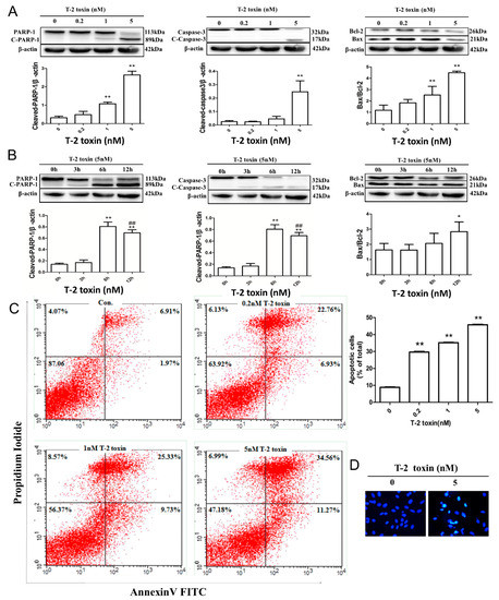 - Chen, J.; Chu, Y.; Cao, J.; Yang, Z.; Guo, X.; Wang, Z. T-2 toxin induces apoptosis, and selenium partly blocks, T-2 toxin induced apoptosis in chondrocytes through modulation of the Bax/Bcl-2 ratio. Food Chem. Toxicol. 2006, 44, 567–573. [Google Scholar] [CrossRef]